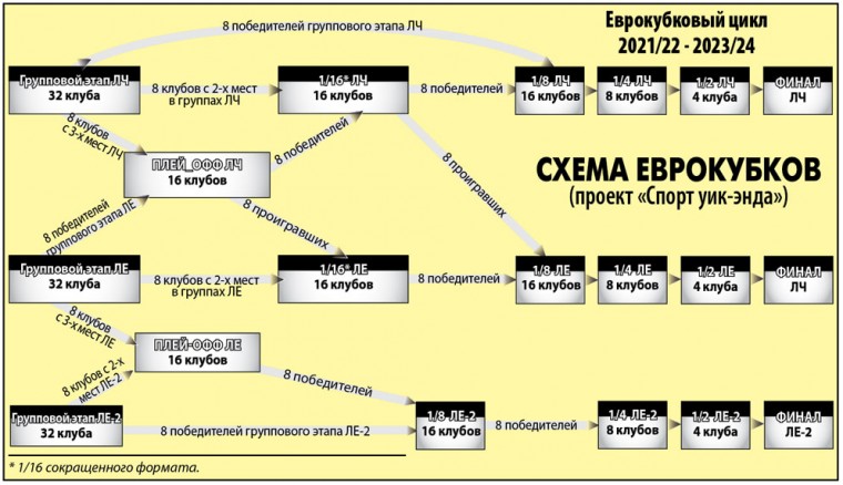 По проекту «СУ» на пути ко встрече в 1/8 финала с победителем группы ЛЧ у второй команды этого турнира будет еще дополнительный плей-офф с занявшими первые места на групповом этапе Лиги Европы. Если представитель обновленного и усиленного еврокубка номер два одолеет сначала 3-ю команду ЛЧ, а затем в 1/16 финала справится и с клубом, занявшим второе место на групповом этапе, то чем он не заслужит право играть в 1/8 финала Лиги чемпионов? (Все эти несложные новации отражены в схеме «Еврокубкового цикла 2021/22 - 2023/24. Проект «Спорт уик-энда»).
