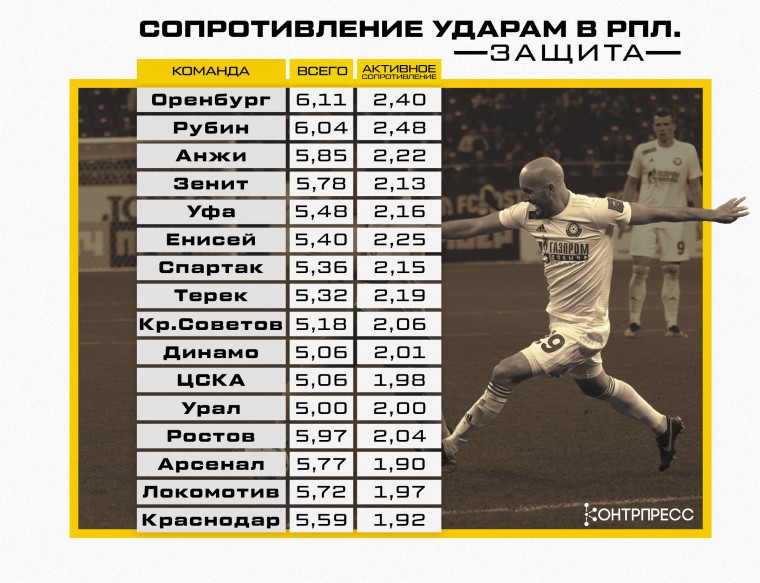 «Оренбург» и «Рубин» – команды с немного другим подходом к обороне. Казанцы позволяют пасовать в центральную зону до штрафной, но агрессивно встречают перед ней, редко допуская передачи за спины защитникам из-за слаженной подстраховки. «Оренбург» садится глубже, чем «Ростов» и «Рубин», и компенсирует индивидуальные проблемы (например, при прострелах в штрафную) численным насыщением зоны перед штрафной. По проценту блокированных ударов от общего количества «Оренбург» – явный лидер чемпионата: 25,7% ударов принимают на себя защитники.