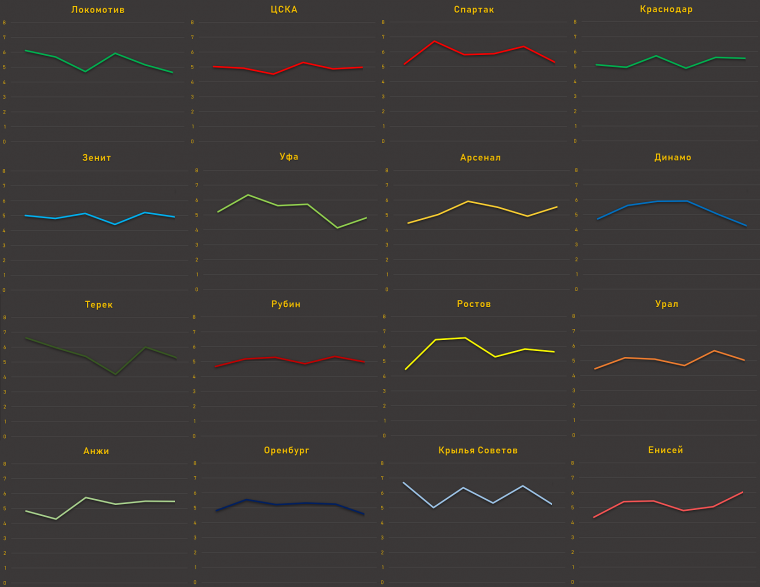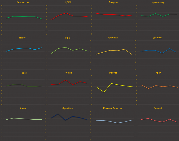 В прошлом сезоне мы считали количество защитников между бьющим и воротами в матчах РПЛ. Получая данные, мы оценивали плотность оборон, альтернативную оценку качества ударов и динамику изменения ударов по ходу сезона. Весной 2018-го мы использовали только один показатель – количество защитников между бьющим и воротами: то есть если вся команда садилась за линию мяча, считалось, что удар встречали 10 защитников.