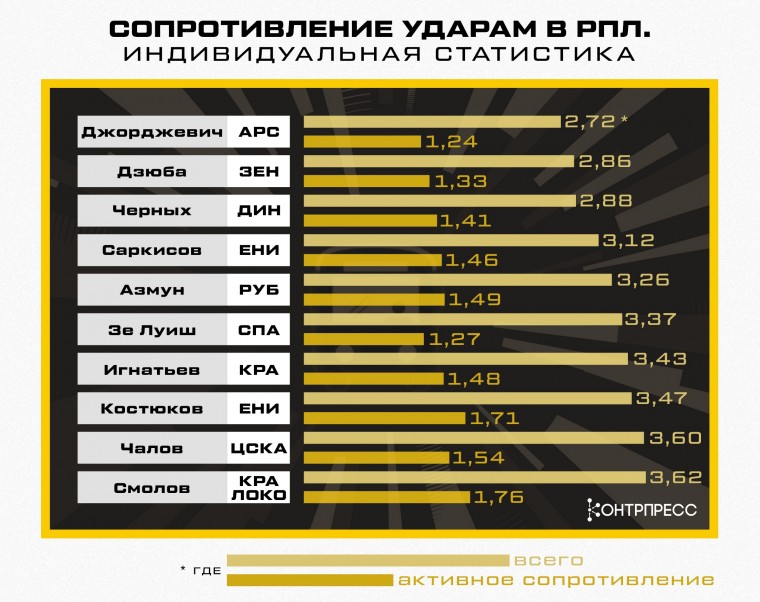 Попадание в топ-5 игроков, чьи удары встречают наименьшее сопротивление, Фёдора Черных и Артура Саркисова объяснимо. Оба чувствуют ситуации, когда ворваться за спину защитнику под заброс из глубины, и тайминг открываний у обоих в порядке. Проблемы возникают со следующим решением – и Черных, и Саркисов, если не бьют первым касанием, могут затянуть с ударом, уйти слишком близко к лицевой.