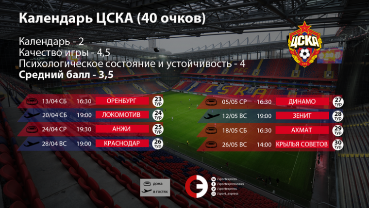 Вместе с тем, после локальных провалов были разгром "Рубина" и победное дерби со "Спартаком", что говорит о правильной реакции коллектива на критику. И все равно кажется, что на финишном отрезке самыми опасными для ЦСКА обещают стать встречи с "Оре3,83нбургом" или "Динамо", а не с равными себе. Ну а в сложнейшем среди всех претендентов на золото расписании есть скрытый плюс. Команда редко проваливается в больших матчах и встречаясь с конкурентами, способна одним выстрелом убить двух зайцев.