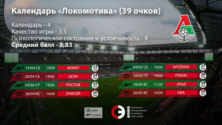 Прежде всего, речь о максимальной реализации таланта Смолова и о том, что может дать команде завершающий лечение Фарфан. Набирающий форму после травмы Фернандеш – еще один козырь в красно-зеленой колоде, а календарь оставшихся матчей у "Локо" не самый сложный. После дерби с ЦСКА и поездки в Ростов команду Семина ждут игры с теми, кто объективно уступает ей в классе. Да, есть фактор Черевченко в "Арсенале" и умеющий доставлять железнодорожникам проблемы Курбан Бердыев. Однако если речь идет о битве за титул, пять последних туров могут стать прямой дорогой к повторению прошлогоднего успеха. Но лишь в том случае, если удастся набрать максимальные обороты и распределить силы с учетом продолжающегося похода за Кубком.