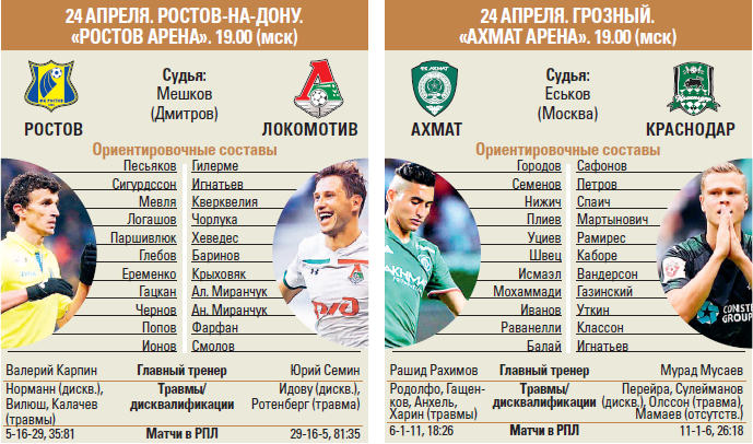 Главный тренер «Краснодара» Мурад Мусаев справедливо заметил после субботнего суперспектакля с «Зенитом»: игра отличная, но результат нулевой, поэтому радоваться нечему. «Быки», пожалуй, выпали из чемпионской гонки и всерьез рискуют покинуть зону Лиги чемпионов, что для команды, которая длительное время пыталась навязать конкуренцию лидеру, станет серьезной неудачей. Ресурсы Мусаева ограничены. Травмирован Кристоффер Олссон, дисквалифицированы автор самого красивого гола 24-го тура Маурисио Перейра и лучший «джокер» РПЛ-2018/19 Магомед-Шапи Сулейманов. А играть предстоит в Грозном против «Ахмата», в составе которого по весне разыгрались бразилец Раванелли («2+5» в последних пяти матчах) и опытный россиянин Олег Иванов (2 гола).