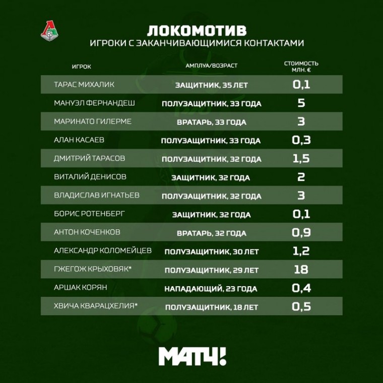 Едва ли останутся в команде трое игроков, которые этот сезон провели в арендах: В.Денисов, Касаев и Корян. Сложно рассчитывать на продление соглашений Кочевнику, Михалику, Коломейцеву, не игравшим в текущем чемпионате. Это же касается и Дмитрия Тарасова — уже давно он не является ключевой фигурой в «Локо». А вот основного правого латераля Игнатьева руководство должно постараться сохранить.