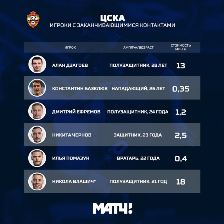 Этим летом ЦСКА окончательно попрощается с некогда перспективным форвардом Базелюком, уже который год колесящим по арендам. Непонятна ситуация с Ефремовым, играющим у Гончаренко эпизодически, и защитником Черновым, потерявшим место в основе по ходу сезона. Их уход вряд ли станет большой потерей для команды, но в качестве игроков ротации они могли бы пригодиться.