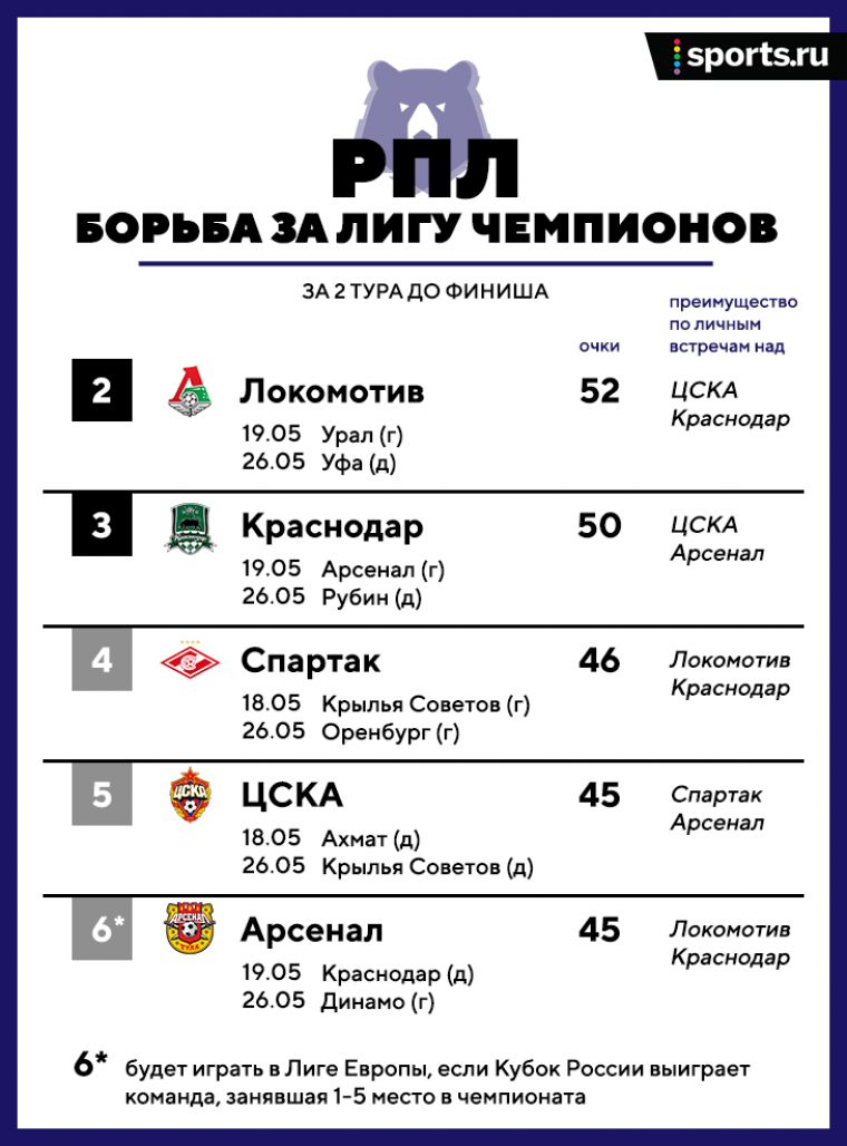 • «Краснодару», чтобы стать вторым, нужно выигрывать в обоих турах (в гостях у «Арсенала» и дома у «Рубина») и ждать либо одного поражения, либо двух ничьих «Локомотива». Ключевым наверняка станет уже следующий тур: в Туле с разогнавшимся «Арсеналом» играть тяжеловато.