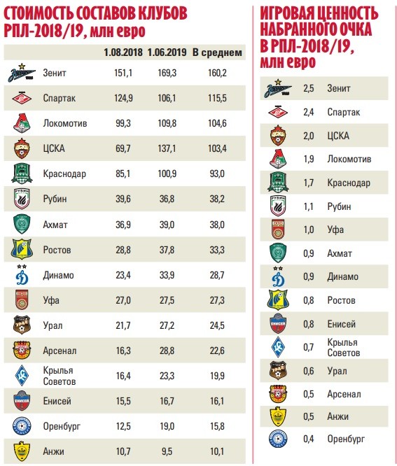 Чтобы учесть временные перепады, мы выстроили клубы по средней стоимости их составов, использовав две крайние отсечки - 1 августа 2018 года и 1 июня 2019-го. Если считать эту величину эквивалентом игрового потенциала, то легко ответить на вопрос: сколько стоило каждое очко, набранное командой в РПЛ-2018/19? Здесь «Зениту» пришлось выдержать серьезную конкуренцию уже не с ЦСКА, а со «Спартаком». Очко сине-бело-голубых соответствовало 2,5 млн евро, красно-белых - 2,4 млн. И гордиться спартаковцам тут нечем. Наоборот - есть повод задуматься, насколько эффективно использовались игровые ресурсы, раз в чемпионате было не второе место, а только пятое.