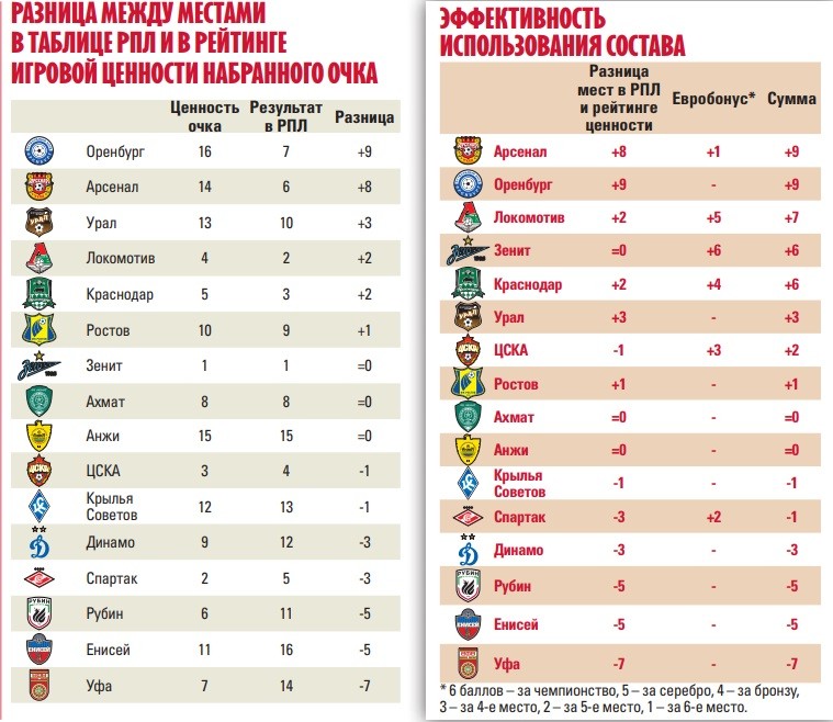 Примеры для подражания в этом плане - «Арсенал» и «Оренбург». Исходя из средней стоимости состава, оренбуржцы «вложили» в каждое набранное очко 400 тысяч евро, туляки - полмиллиона. Это соответственно 16-е и 14-е места в рейтинге всей РПЛ. А теперь вспомните, на каких позициях расположились команды Владимира Федотова и Игоря Черевченко в итоговой таблице премьер-лиги. На шестом и пятом! Помимо них, в «плюсе» (когда турнирный результат положительно отличался от позиции в упомянутом рейтинге) также оказались «Урал» (+3 места), «Локо», «Краснодар» (по +2) и «Ростов» (+1). А самый большой «минус» заработала «Уфа» (отрицательная разница в семь мест), подтвердив недавнее высказывание своего гендиректора Шамиля Газизова: «Потенциал нашего состава позволял досрочно решать задачу выживания в РПЛ, не доводя дело до стыковых матчей».