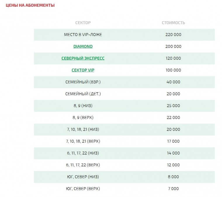 VIP: от 34 000 (РПЛ), 43 500 (РПЛ + ЛЕ), 51 000 (все домашние матчи) до 184 500 (РПЛ), 225 000 (РПЛ + ЛЕ), 256 000 (все домашние матчи)