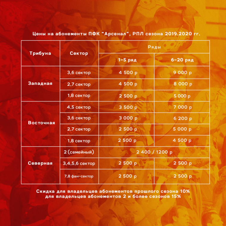 На центр: от 11 000 (РПЛ), 15 000 (РПЛ + ЛЕ), 17 000 (все домашние матчи) до 23 000 (РПЛ), 30 000 (РПЛ + ЛЕ), 35 500 (все домашние матчи)