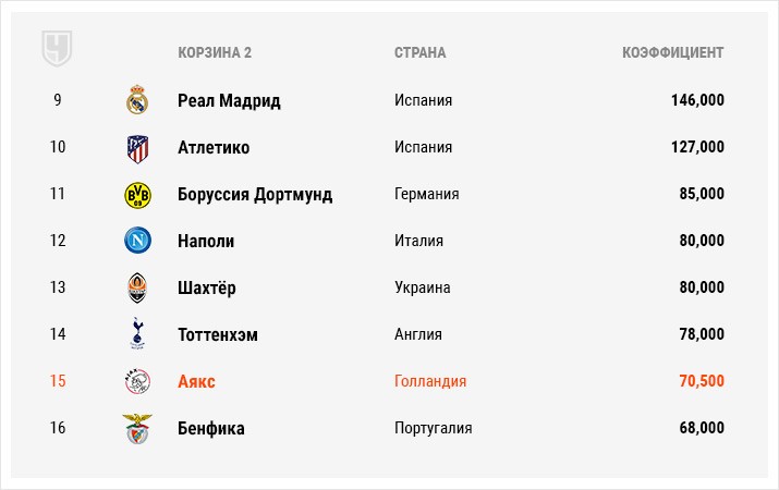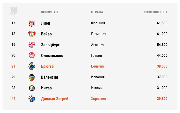 «Краснодар» пока ещё не попал в основной раунд главного клубного турнира Европы. Но если краснодарский клуб пройдёт «Олимпиакос», то гарантированно попадёт в третью корзину. Там же останутся и греки в случае успешного для них исхода. Таким образом есть шанс, что ни одна из российских команд не будет находиться в четвёртой корзине перед жеребьёвкой, где расположены самые слабые клубы, исходя из коэффициентов УЕФА. Отметим также, что мы указываем варианты корзин при условии, что проходят команды с более высоким рейтингом.