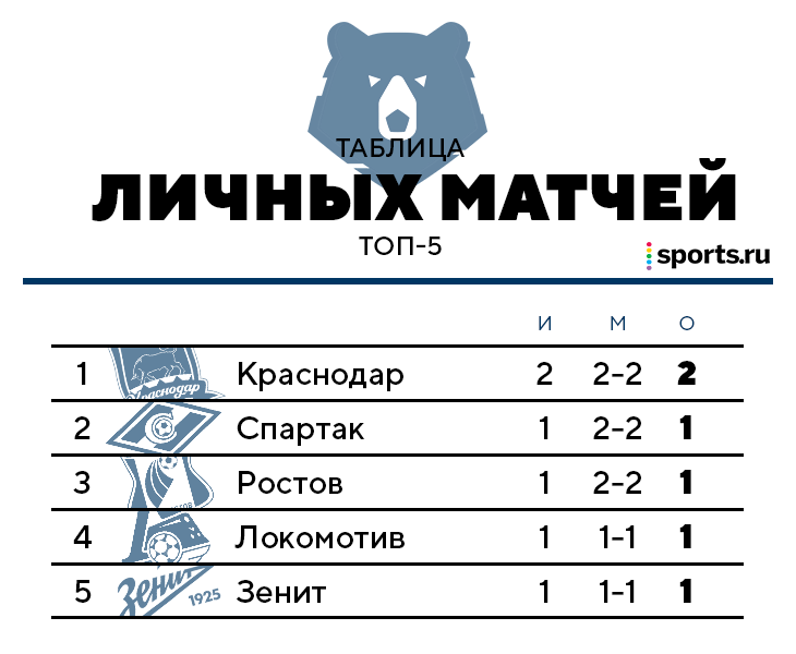 Все чуть сложнее, чем обычно. В случае равенства очков в РПЛ смотрят на личные матчи – даже если на место претендует больше двух команд. Поэтому нужно представить мини-турнир с участием пяти первых клубов. «Спартак», «Ростов», «Локомотив» и «Зенит» сыграли с командами из топ-5 только по одному матчу (все набрали по одному очку), а «Краснодар» – два (с «Локо» и «Зенитом», оба вничью).