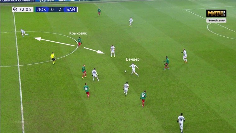 Здесь Свен Бендер получает полную свободу сразу после потери. «Локо» просто не мог накрывать его сразу из-за плохих позиций в момент потери. У Бендера масса вариантов – от прямого обострения за спину защитникам до паса в опорную зону. Крыховяк один должен держать двух соперников (и в данном эпизоде он именно разрывается между ними, а не контролирует обоих как в ситуации при прессинге):