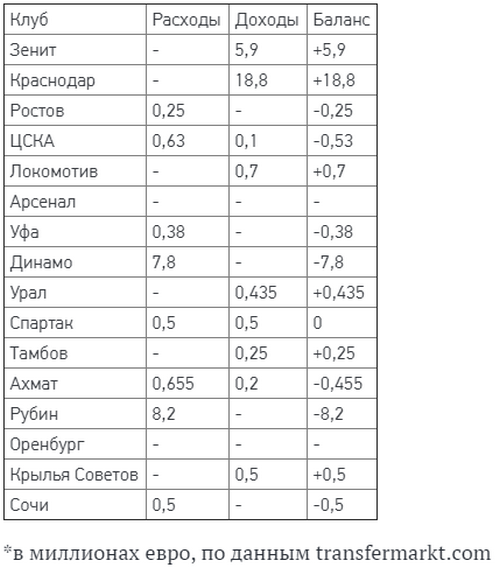 В общем и целом российские клубы потратили этой зимой 18,915 миллиона евро. Заработав едва ли не в два раза больше — около 30 миллионов. Один «Краснодар» выручил 18,8 млн (помимо Игнатьева и Скопинцева, еще Куэва ушел в «Сантос» за 6 млн, а Намли — в аренду в «Колорадо» за 1,5 млн). Плюс «Зенит» получил 5,9 миллиона евро за продажу Краневиттера в «Монтеррей».*в миллионах евро, по данным transfermarkt.com
