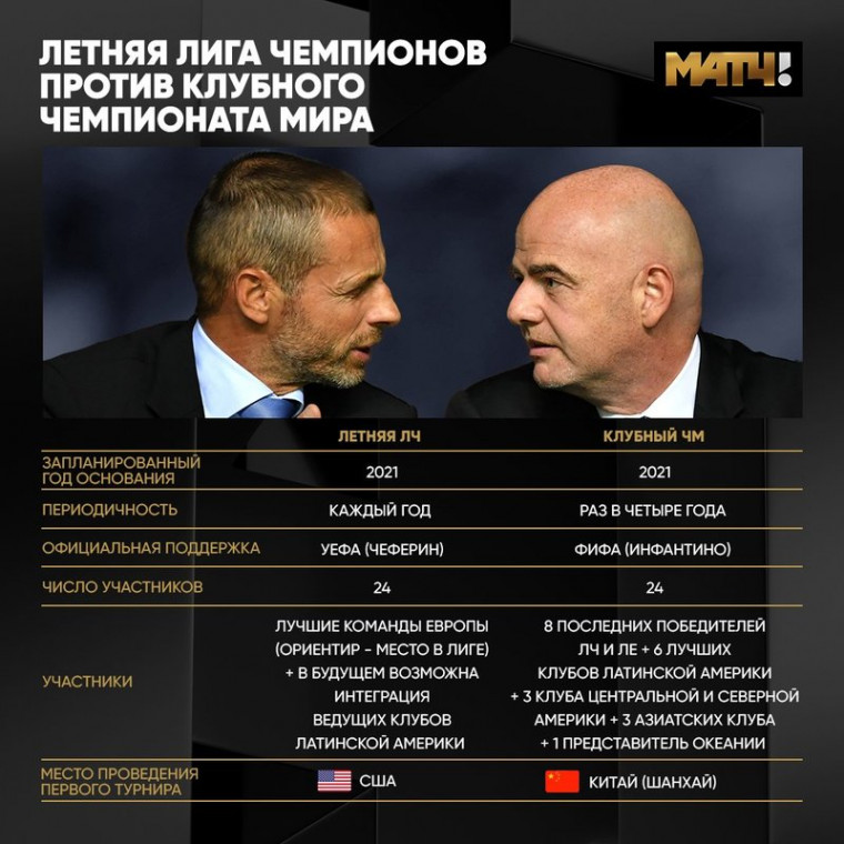 На прошлой неделе президент УЕФА Чеферин перешел к ответным действиям и дал понять, что поддержит создание летней Лиги чемпионов. Она станет развитием проекта Международного Кубка чемпионов. УЕФА предоставит бренд главного клубного турнира и официальный статус, что точно сделает его более престижным и коммерчески привлекательным. Кроме того, доработают и сам формат соревнования, который нуждается в приведении в порядок.
