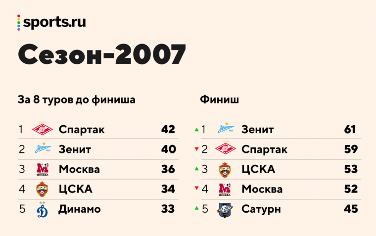 Одна из самых запутанных гонок в истории – в 22-м туре «Ростов» Бердыева вынес «Спартак» Аленичева, а ЦСКА Слуцкого без особых шансов проиграл «Зениту» Виллаш-Боаша 0:2. «Ростов» шел в лидерах до 25-го тура и даже разгромил питерцев 3:0, но потом посыпался в Мордовии. ЦСКА почти не терял очки на финише, но до титула дошел только в 30-м туре – и если бы не гол Дзагоева «Рубину», то чемпионом был бы Бердыев.