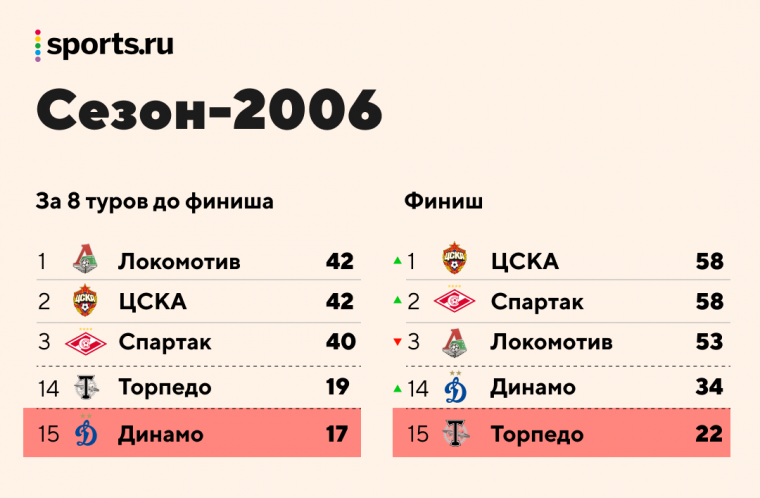 История «Динамо» простая: все началось с домашнего поражения в 22-м туре от «Краснодара» (1:4), далее семь поражений в восьми матчах (в этот отрезок вошла отставка Кобелева за три тура до финиша), оскорбления от своих фанатов и падение в ФНЛ.