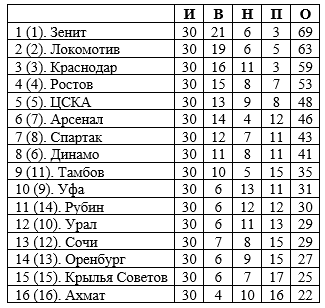 Итоговая таблица чемпионата тогда примет следующий вид. В скобках для каждого клуба указано место, которое он занимает после 22 туров.