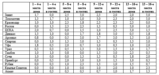 Исход каждого отдельного матча оценивался следующим образом: если разница между полученными ранее средними величинами у соперников составляла менее единицы, фиксировалась ничья. При большем разрыве фавориту засчитывалась победа. Запутались? Тогда приведем наглядный пример. «Сочи» в матчах с командами из первой четверки в среднем набирал одно очко (одна победа и два поражения – 3 делить на 3 равно 1). А «Ростов» в гостях у команд третьей четверки – 0,3 очка (ничья и два поражения – 1 делить на 3 равно 0,3). Разница между «сочинской» единицей и «ростовскими» тремя десятыми – 0,7. Значит, матч 23-го тура «Сочи» – «Ростов» надо зачитывать как ничейный. Аналогично во встрече того же тура «Локомотив» – «Оренбург» мы зафиксируем победу хозяев, так как здесь разрыв в средних величинах составляет полтора – 2,0 против 0,5.
