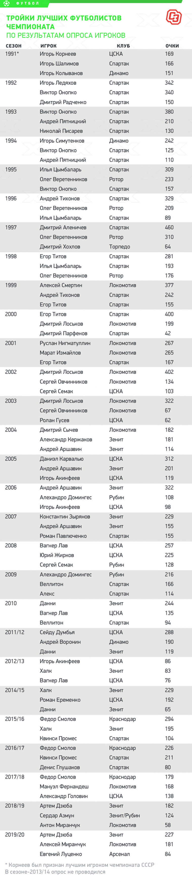 Дзюба принес «Зениту» шестую победу в опросе. До его дубля почетное звание получали Андрей Аршавин (2006), Константин Зырянов (2007), Данни (2010) и Халк (2014/15). Чаще питерцев признание коллег зарабатывали только спартаковцы — семь раз. По пять побед у игроков «Локомотива» и ЦСКА, три — у «Краснодара», по одной — у «Динамо» и «Рубина».