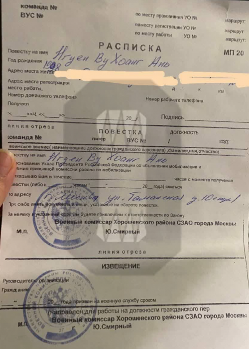 В Москве вручили повестку 24-летней гражданке Вьетнама, которая два года назад получила российское гражданство