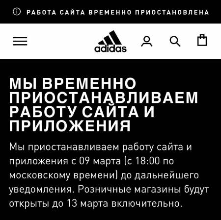 ⚡️ Adidas приостанавливает работу сайта с 9 марта и временно закрывает магазины в России с 14 марта