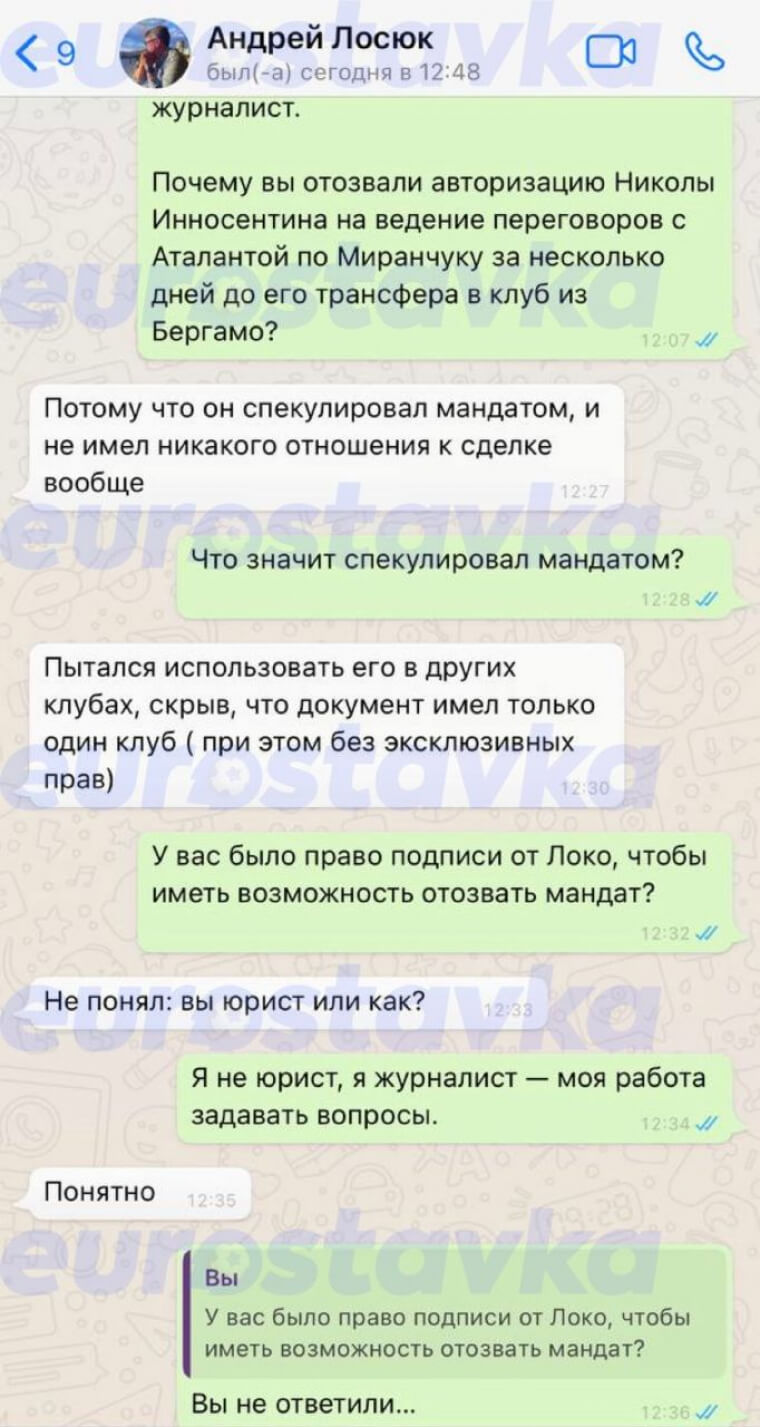 При этом, в письме Лосюк написал, что благодарен Инносентину за «роль в переговорах по Миранчуку с «Аталантой». Этими словами он фактически признал, что у итальянского агента был мандат, и он сыграл важную роль в переговорах.
