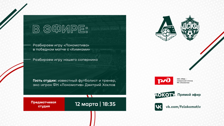 Специальным гостем студии станет экс-игрок ФК «Локомотив» Дмитрий Хохлов, который в компании с ведущим Лашой Бахсолиани обсудит всё самое интересное о предстоящей игре.