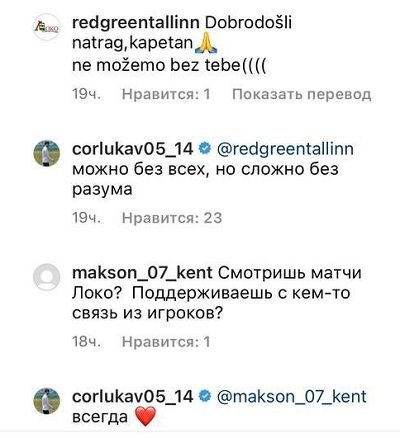 Чорлука опубликовал в ответ на эту публикацию лишь один эмодзи — человек, прижимающий ладонь к лицу, так называемый «фейспалм». Также Ведран ответил пользователям социальной сети, что не перестаёт смотреть матчи «Локомотива», при этом отметив, что «Локомотиву» не хватает не самого Чорлуки, а разума.
