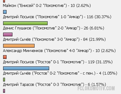 41 20 декабря 2011, вторник, 19:32 Гол Лоськова в ворота "Ростова" стал лучшим [июль] Гол Дмитрия Лоськова в ворота "Ростова" стал лучшим июльским!7. Дмитрий Лоськов ("Ростов" 0-1 "Локомотив")Лучшим голом июня признан гол Дмитрия Лоськова в ворота "Динамо" Выбираем лучший гол "Локо" в июле! Дмитрий Лоськов ("Ростов" 0-1 "Локомотив") - 136 (31.7%) 31.7%Дмитрий Лоськов ("Локомотив" 1-0 "Амкар") - 127 (29.6%) 29.6%Дмитрий Сычёв ("Локомотив" 3-0 "Амкар") - 95 (22.14%) 22.14%Денис Глушаков ("Локомотив" 2-0 "Амкар") - 28 (6.53%) 6.53%Владислав Игнатьев ("Енисей" 0-1 "Локомотив") - 10 (2.33%) 2.33%Майкон ("Енисей" 0-2 "Локомотив") - 10 (2.33%) 2.33%Александр Минченков ("Локомотив" 4-0 "Амкар") - 10 (2.33%) 2.33%Дмитрий Тарасов ("Ростов" 0-3 "Локомотив") - 8 (1.86%) 1.86%Дмитрий Сычёв ("Ростов" 0-2 "Локомотив" - с пен.) - 5 (1.17%) 1.17% Голосовать Результаты опроса Sherlock Holmes Новости ФК Локомотив 0.516.5