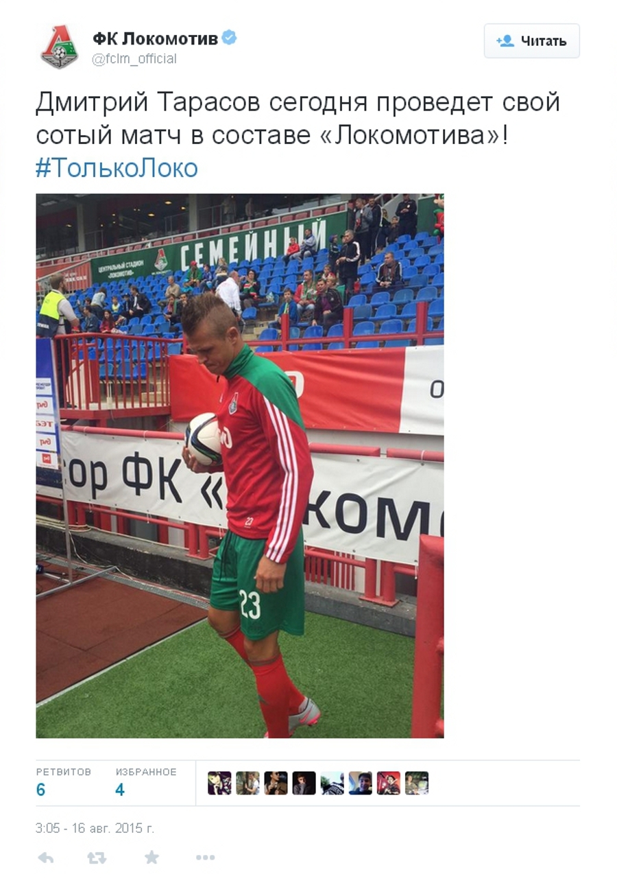 Полузащитник «Локомотива» Дмитрий Тарасов выйдет в стартовом составе «железнодорожников» в матче 5-го тура российской Премьер-Лиги с «Тереком». Для 28-летнего Тарасова сегодняшний матч станет 100-м в составе «Локомотива». Тарасов перебрался в стан красно-зелёных в 2010 году.