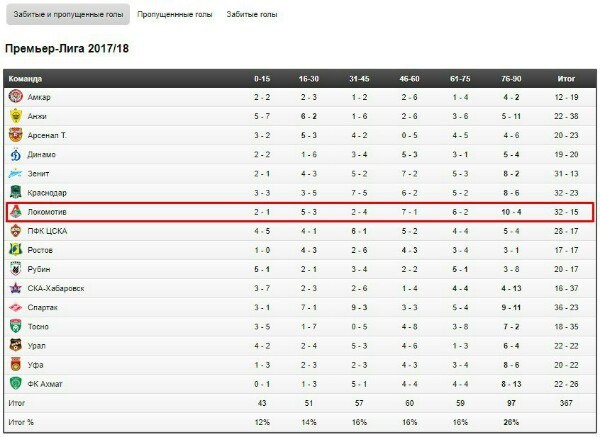 — во всех турнирах «Локомотив» забил 8 голов в концовках матчей и 5 голов в добавленное время.