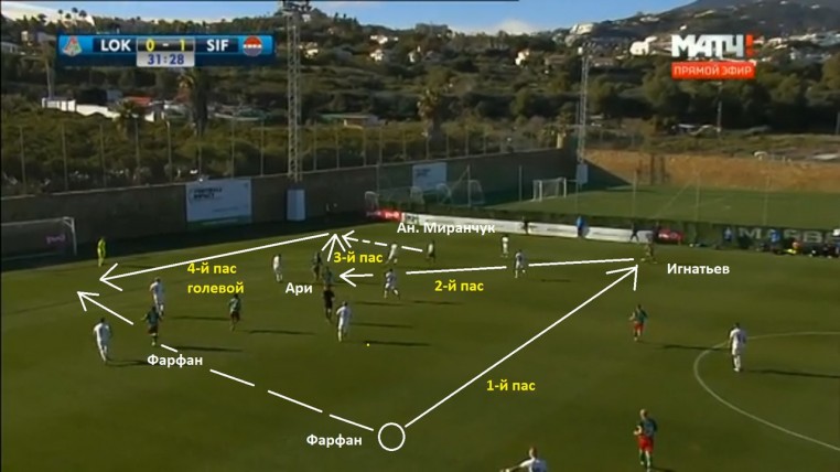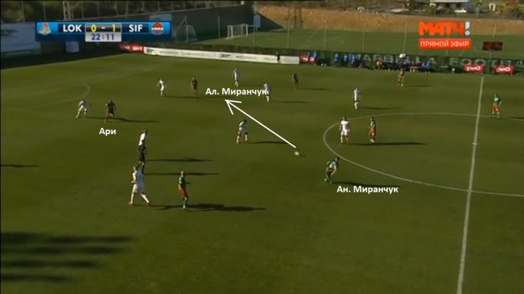 Контроль мяча в задней линии дает «Локо» две вещи. Во-первых, позволяет вертикально растянуть оборонительное построение соперника, что создает зоны для рывков резвого Фарфана, а также техничных братьев Миранчуков. Их в эти зоны можно забросить либо прямой передачей, либо пасом на Ари и скидкой от него.