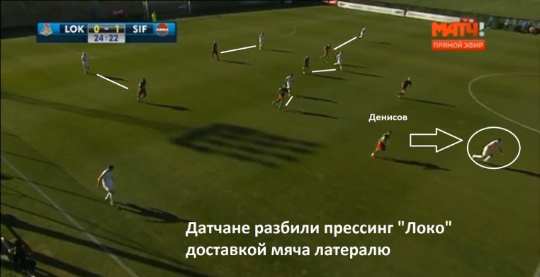 Главной проблемой стали латерали соперника, которых не успевали встретить. И «Стремсгодсет» сделал для этого все: крайнему защитнику, по флангу которого шло наступление, не позволял выдернуться на латеряля один из форвардов. Другой форвард в это же время открывался в зоне опорника Денисова. Плюс был третий форвард, игравший на острие. Получалось так: трех датских защитников прессинговали три наших форварда (Фарфан - Ари - Алексей Миарнчук), двух центральных полузащитников - два наших хава (Антон Миранчук и Фернандеш), а на латералей выдвинуться было некому.