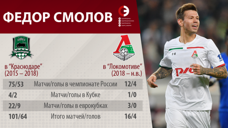Вскоре «Краснодар» продал Смолова в «Локомотив» — по данным «СЭ», за 9 миллионов евро. Первая половина сезона в «Локо» у нападающего тоже не задалась. Он провалил несколько игр, да еще и получил две травмы — одну из них в игре со своим бывшим клубом.