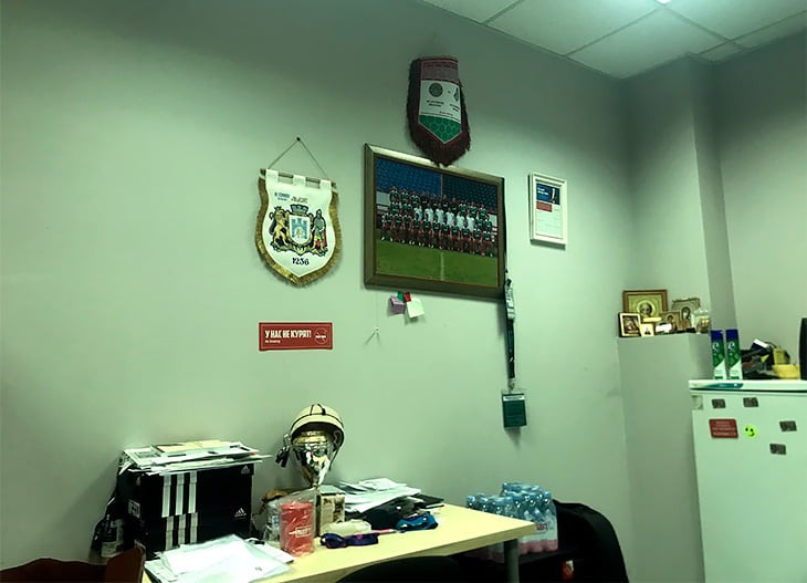 Администраторы «Локо» сидят на первом этаже стадиона: два дивана и кресло, холодильник (где хранится принесенный из дома обед и выпивка на случай победы), стол, чайник, банка меда и сладости. На деревянных полках лежит посуда, пакеты с мячами и манишками, красные локомотивские кофты и чемоданы с эмблемой, за ними идут связки аккредитаций, старые программки, распечатки составов и много-много бумаг. На стене – состав «Локомотива» времен Божовича. Есть уголок с иконами и железнодорожная фуражка – ее подарили Семину, когда «Локо» тестировал новую кольцевую дорогу МЦК. Вымпел из Львова – презент Палычу на день рождения от украинских друзей.