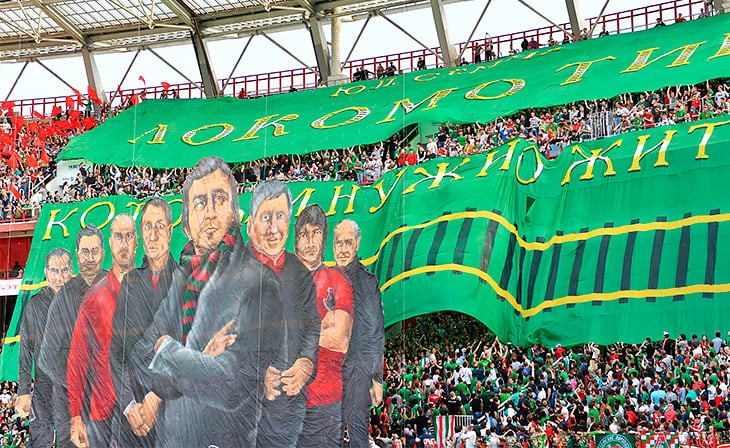 • На чемпионском матче с «Зенитом» в 2018-м фанаты «Локо» подняли перфоманс на всю трибуну: легенды клуба (Егорыч справа от Семина) крупным планом и знаменитая фраза Юрия Палыча: «Локомотив», которым нужно жить».