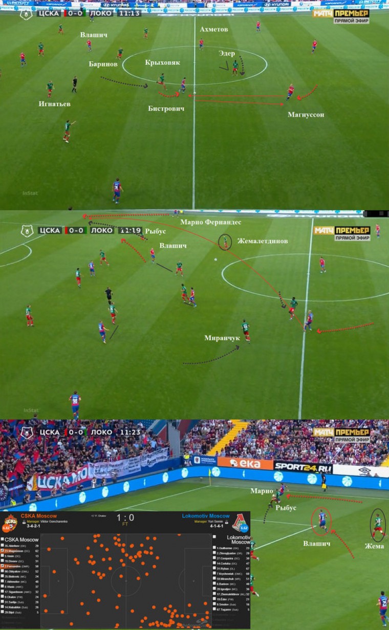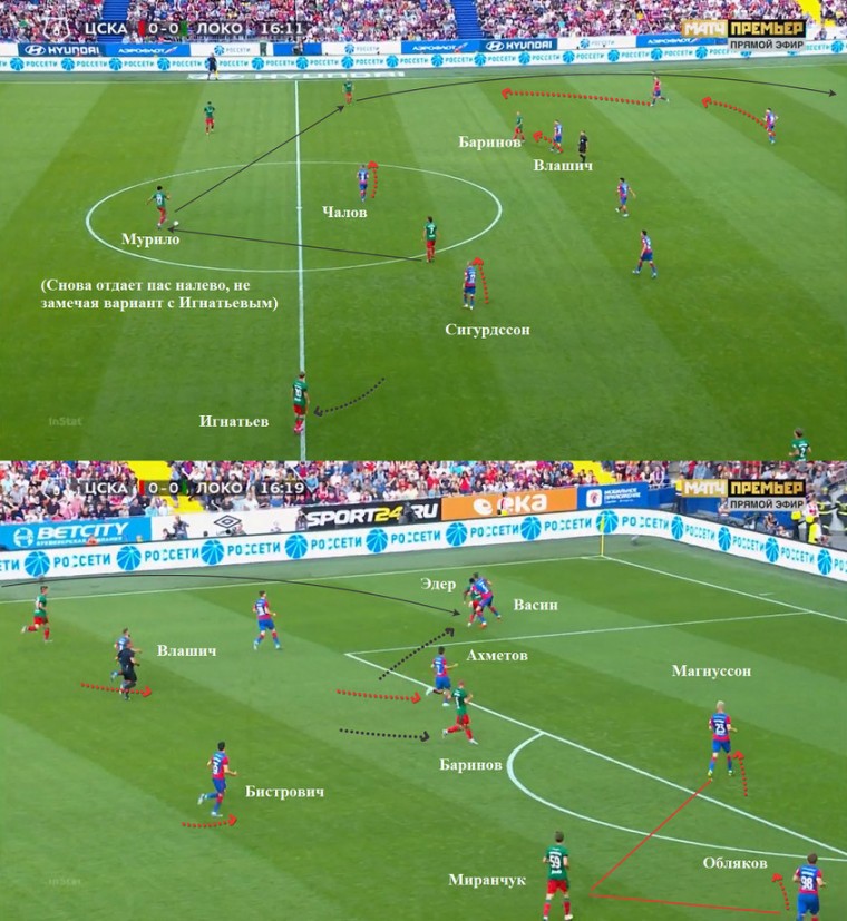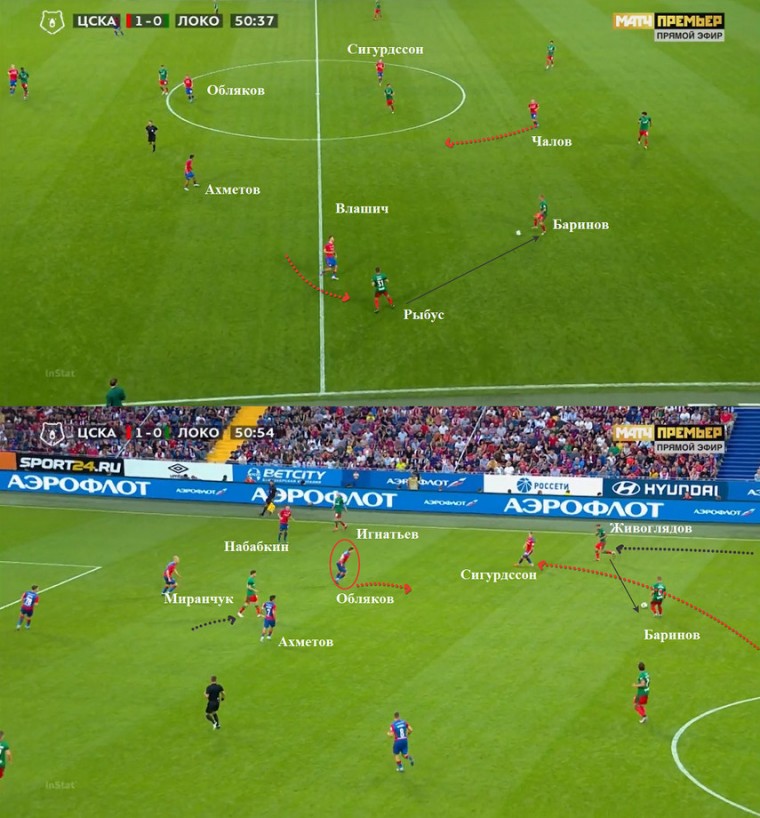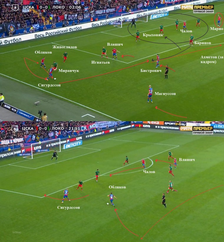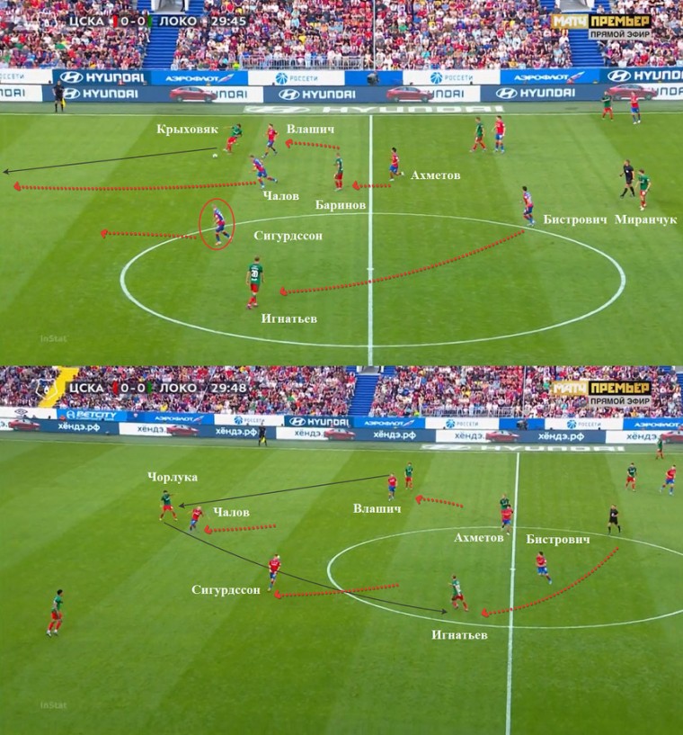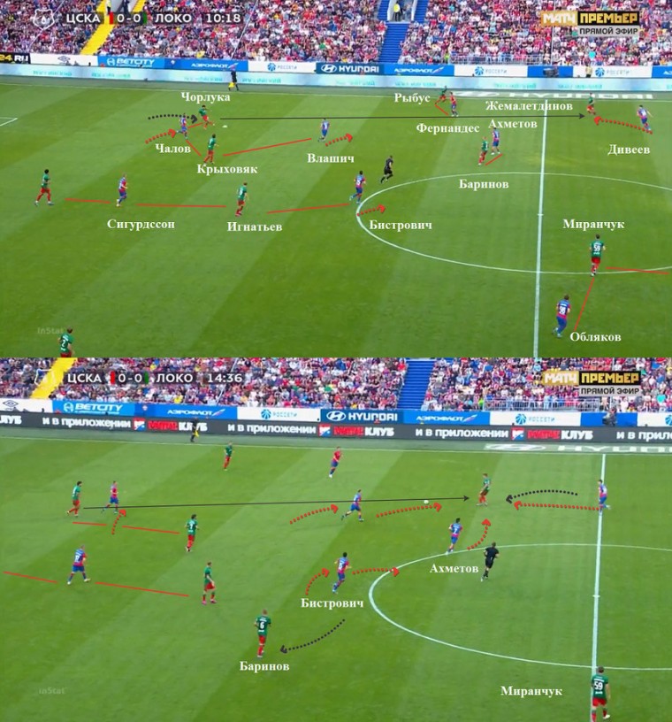 В первую очередь ЦСКА должен был заставить «Локомотив» больше использовать левый фланг, на котором находился не Алексей Миранчук, а Жемалетдинов. В высоком прессинге Чалов и Сигурдссон старались оказывать давление на Мурило и Чорлуку, одновременно перекрывая линию передач на Игнатьева и Крыховяка (если те не отходили глубже и шире); Влашич и Бистрович контролировали одновременно Игнатьева и Крыховяка и передачи в свой полуфланг; Ахметов контролировал пространство между линиями и следил за полузащитником «Локомотива» (как правило – Бариновым), если он там оказывался. «Армейцам» помогла правоногость Чорлуки, который в паре с Мурило играл левее – Чалову гораздо проще было закрывать ему возможность отдать передачу на того же Мурило или в центр.