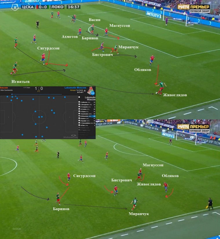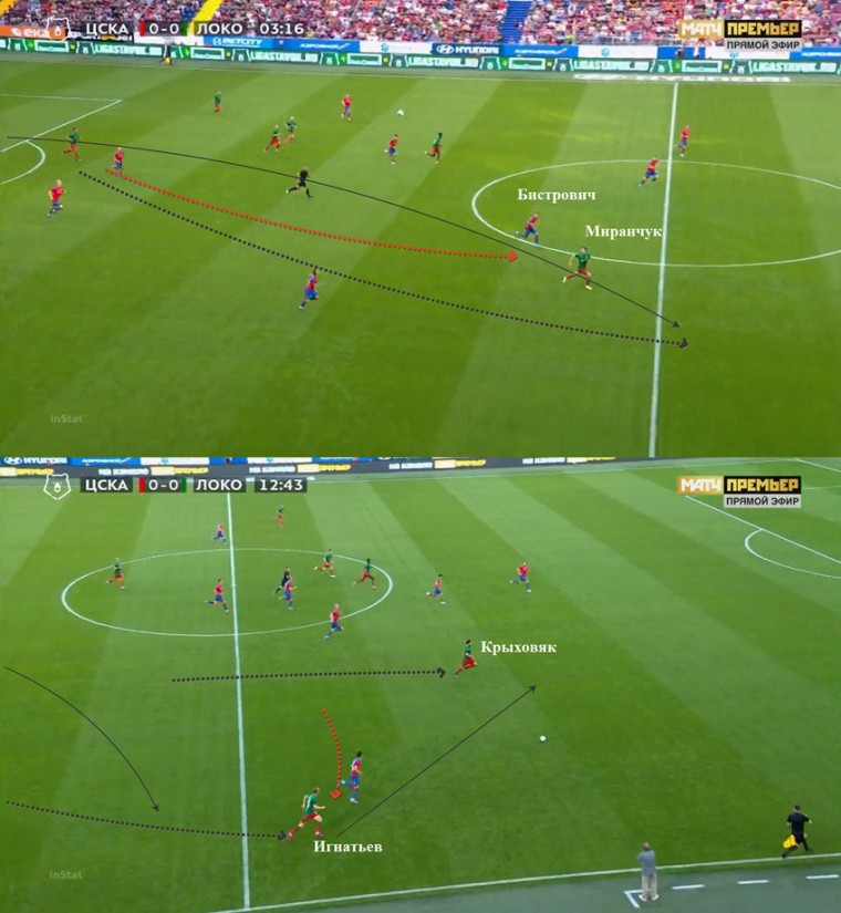 «Локомотив» в первом тайме всё-таки несколько раз доводил мяч до своего правого фланга. В таких ситуациях ЦСКА либо включался в очень агрессивный прессинг и старался атаковать соперников до приема (Обляков вылетал на Живоглядова только в подобных случаях), либо пытался создавать 2v1 против Миранчука за счет контроля Алексея Бистровичем и наличия подстраховки. Магнуссон в таких случаях опускался глубже и контролировал Игнатьева, который также сделал несколько рывков к штрафной хозяев.