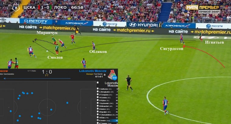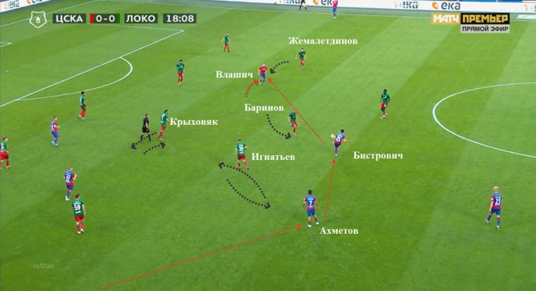 Когда ЦСКА загонял «Локо» направо, у гостей оставалось два варианта: заброс вперед или пас назад. Тройка полузащитников «армейцев» не обязательно формировала четкий треугольник: Влашич обычно располагался повыше, Бистрович варьировал свою позицию в зависимости от положения Миранчука, а Ахметов – в зависимости от расположения ближайшего полузащитника «Локомотива» между линиями. При этом Сигурдссон опускался чуть глубже и закрывал прямой перевод на Игнатьева.