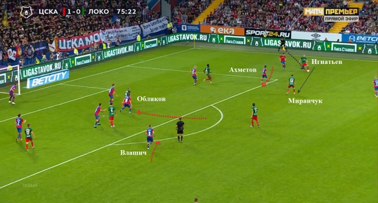 В эпизоде выше, например, Обляков ушел из опорной за Бариновым, Влашич не успел добежать из противоположного полуфланга (мяч быстро перешел с левого фланга на правый), а Ахметов просто упустил Миранчука и дал ему пробить.