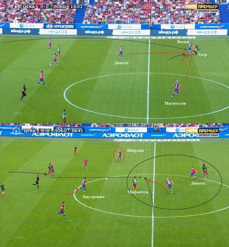 С другой стороны, полуопасные контратаки у «Локо» всё равно возникали – ЦСКА часто срывал такие выпади фолами: Бистрович сел на желтую уже на 4-й минуте и был заменен, вероятно, во многом по этой причине, Магнуссон получил карточку в концовке первого тайма. Основная проблема заключалась в следующем: несмотря на использование трех игроков в первой линии, один из них при атаках в любом случае поднимался выше по полуфлангу – сзади оставалось двое, и длинная передача на Эдера (португалец чаще открывался в левом полуфланге или фланге) с рывком Миранчука из фланга могла создать ситуацию 2v2.