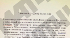 В распоряжении «Матч ТВ» оказалось письмо от медицинских сотрудников «Локомотива» в адрес генерального директора клуба Владимира Леонченко по поводу назначения Алексея Репетюка на пост главы медицинского департамента железнодорожников