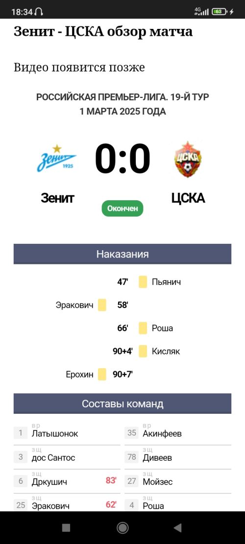 Зенит — ЦСКА обзор матча